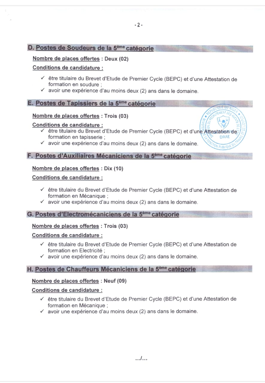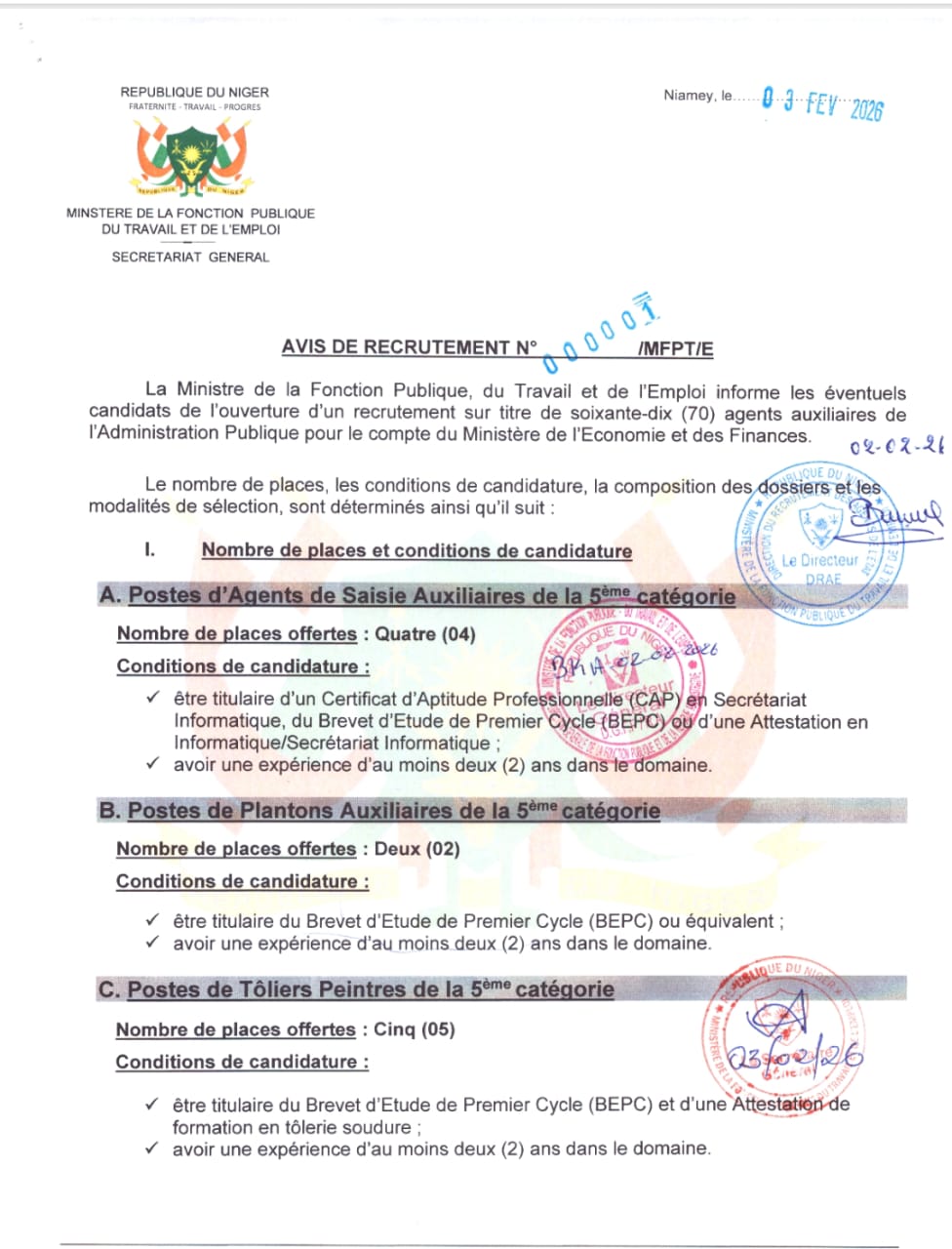 Le Ministère de la Fonction Publique, du Travail et de l’Emploi porte à la connaissance du public l’ouverture d’un recrutement de soixante-dix (70) agents auxiliaires de l’Administration publique, pour le compte du Ministère de l’Économie et des Finances.