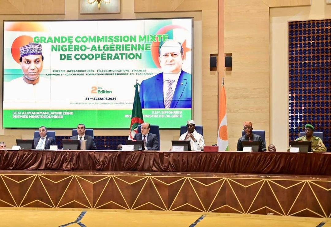 Ce lundi 23 mars 2026, Niamey a abrité la cérémonie d’ouverture de la deuxième session de la Grande Commission mixte algéro-nigérienne de coopération, qui s’est tenue au Centre international de conférences Mahatma Gandhi. La rencontre a été coprésidée par S.E. Ali Mahaman Lamine Zeine, Premier Ministre du Niger, et S.E. Sifi Ghrieb, Premier Ministre de l’Algérie.