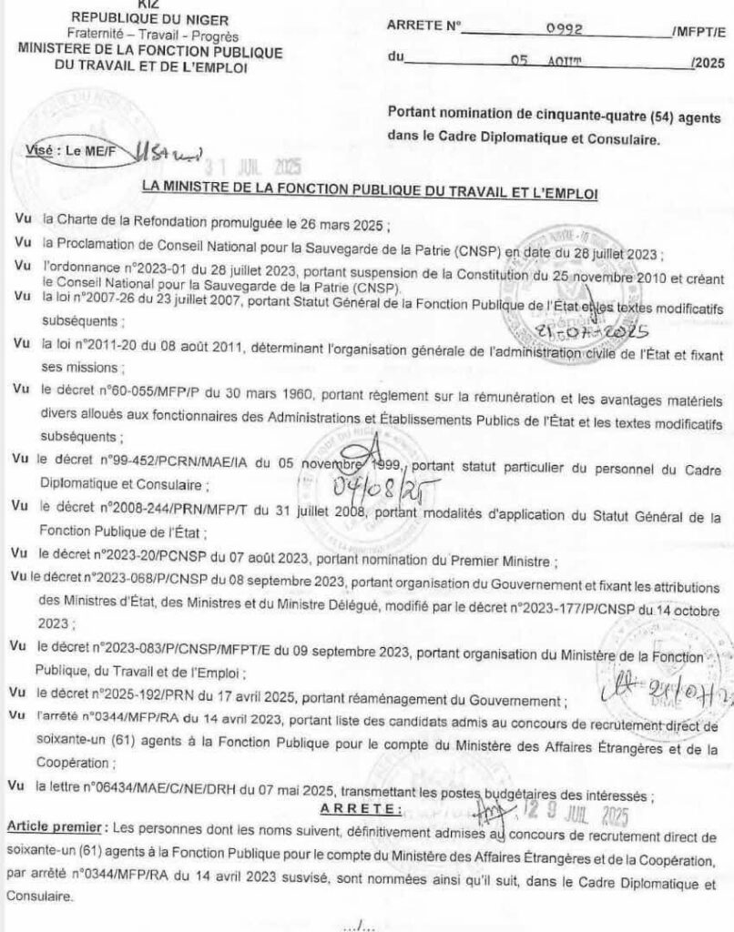 MFPTE : Recrutement de nouveaux agents dans le cadre Diplomatique et Consulaire au Ministère des Affaires Étrangères Niamey, le 06 août 2025 – Trois (03) arrêtés ont été publiés, portant nominations de plusieurs agents dans les cadres Diplomatique et Consulaire, à l’issue du concours direct organisé pour le Ministère des Affaires Étrangères. Ce recrutement traduit […]